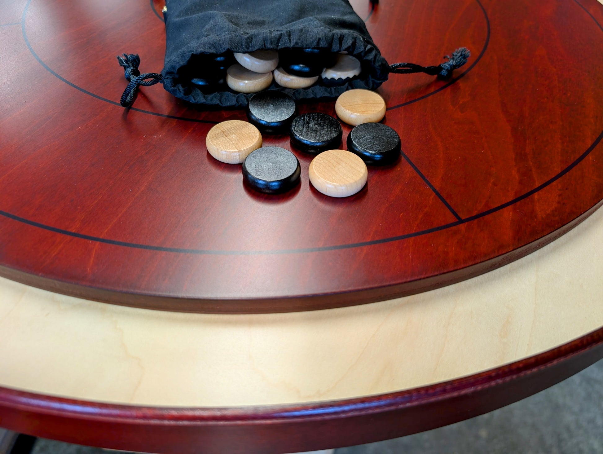 - 26 maple checkers. (24 required for a game + 1 extra of each colour).