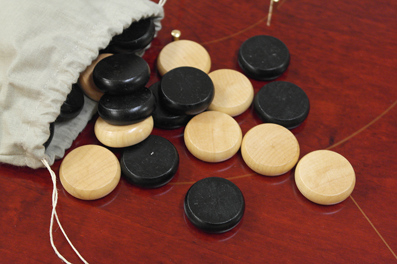 - 26 maple checkers. (24 required for a game + 1 extra of each colour).