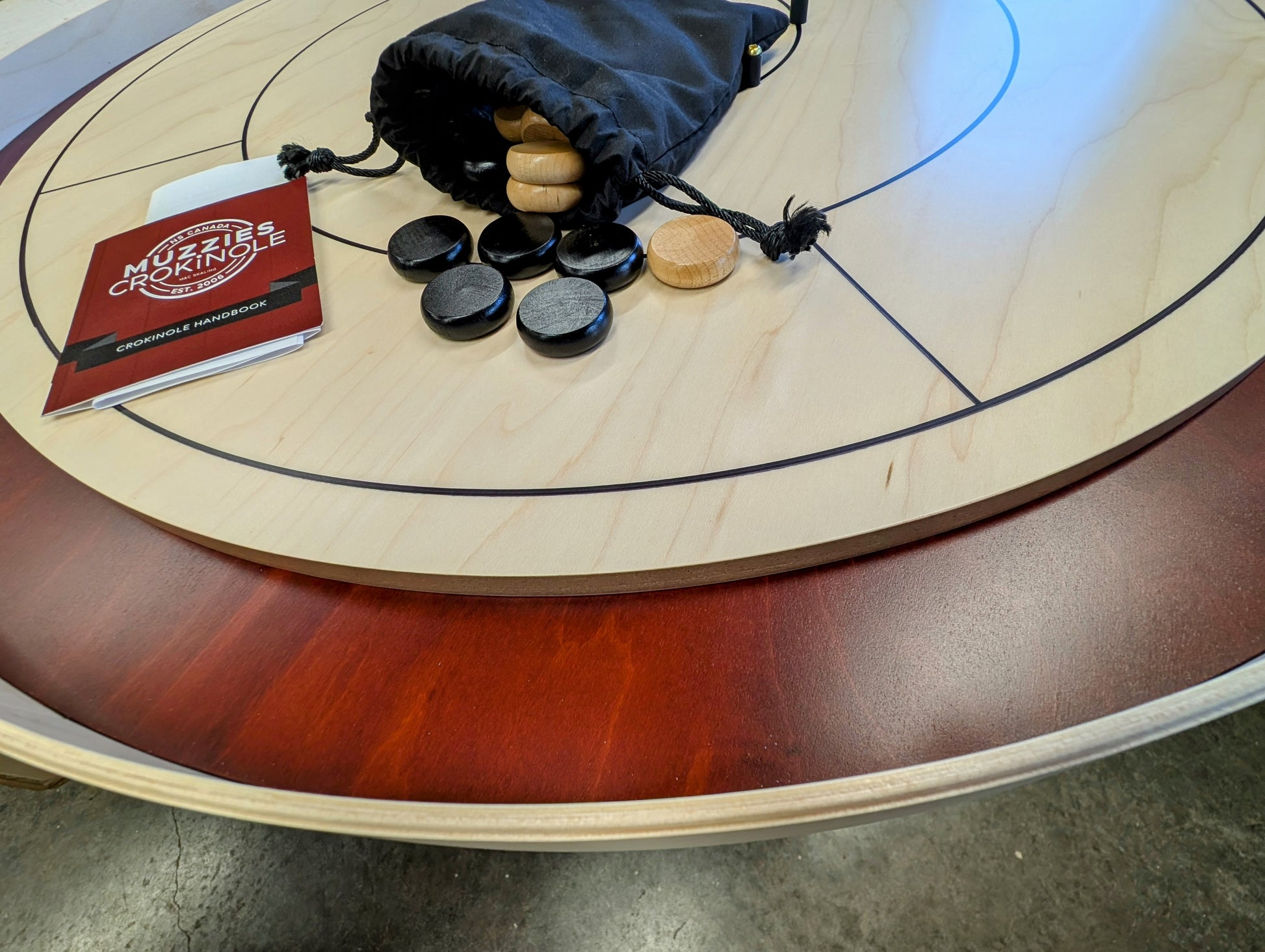 - Gameplay instructions (glossy, full colour “Crokinole Handbook”)