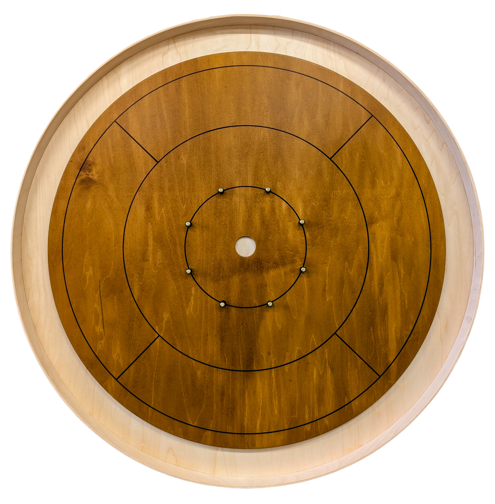 - Dimensions: 26″ playing surface, dropping 1/2″ to a full 2″ gutter/ditch. The side rail is 1/4″ of solid maple, so this makes the board 30-1/2″ overall. The middle hole is 1-3/8″.